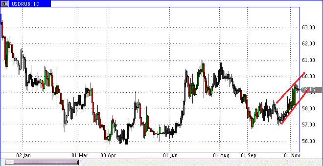 Доллар/рубль пока не пробьет уровень 59,44 и не закрепиться выше указанного уровня, пока не стоит покупать валютную пару, потому что на рынке может быть боковик.